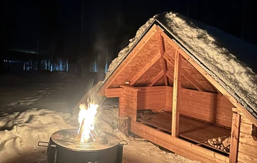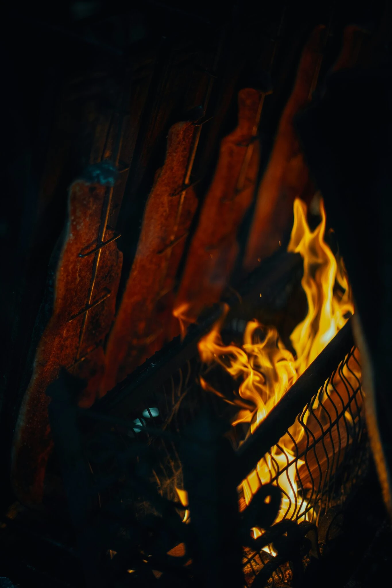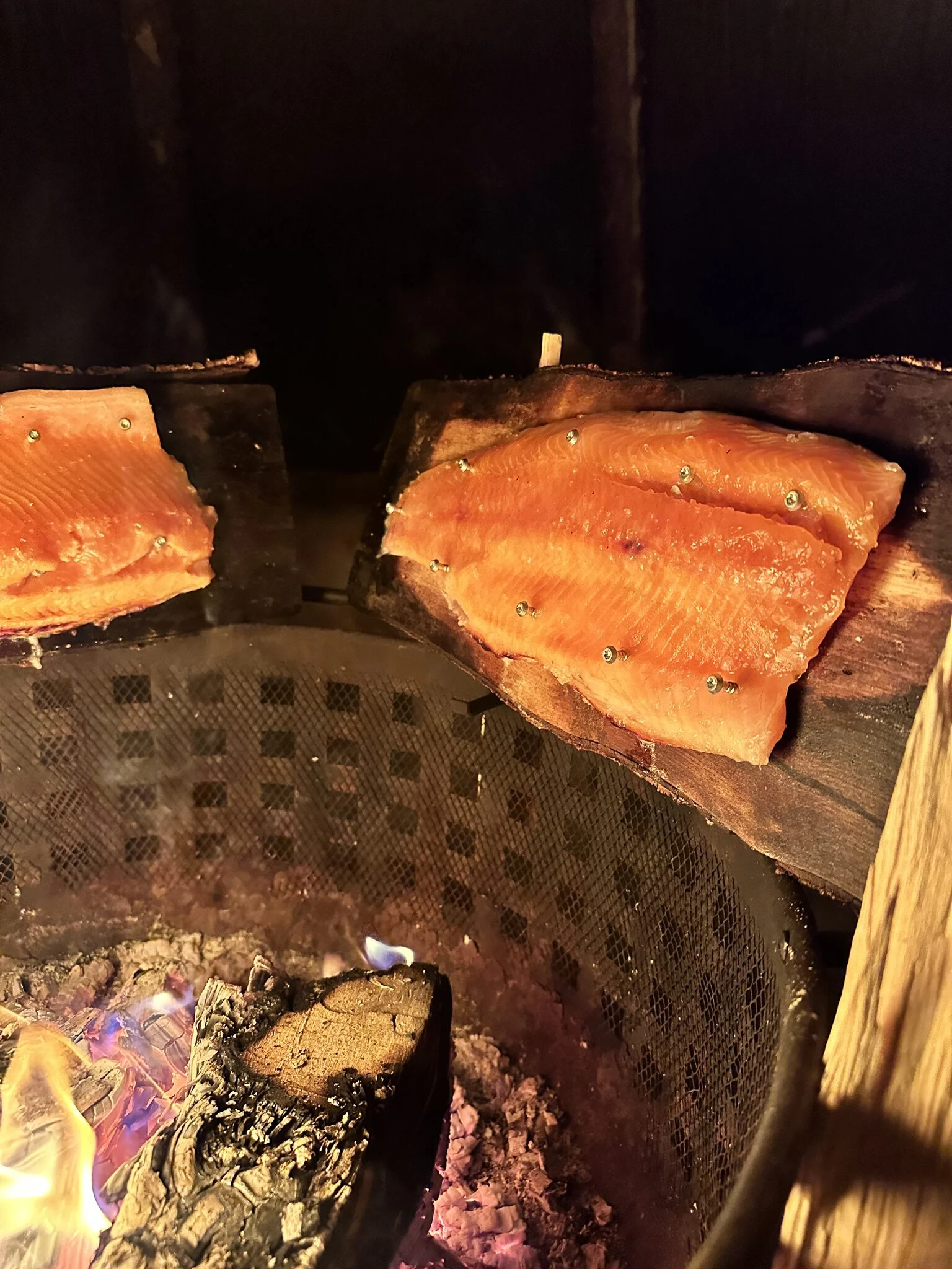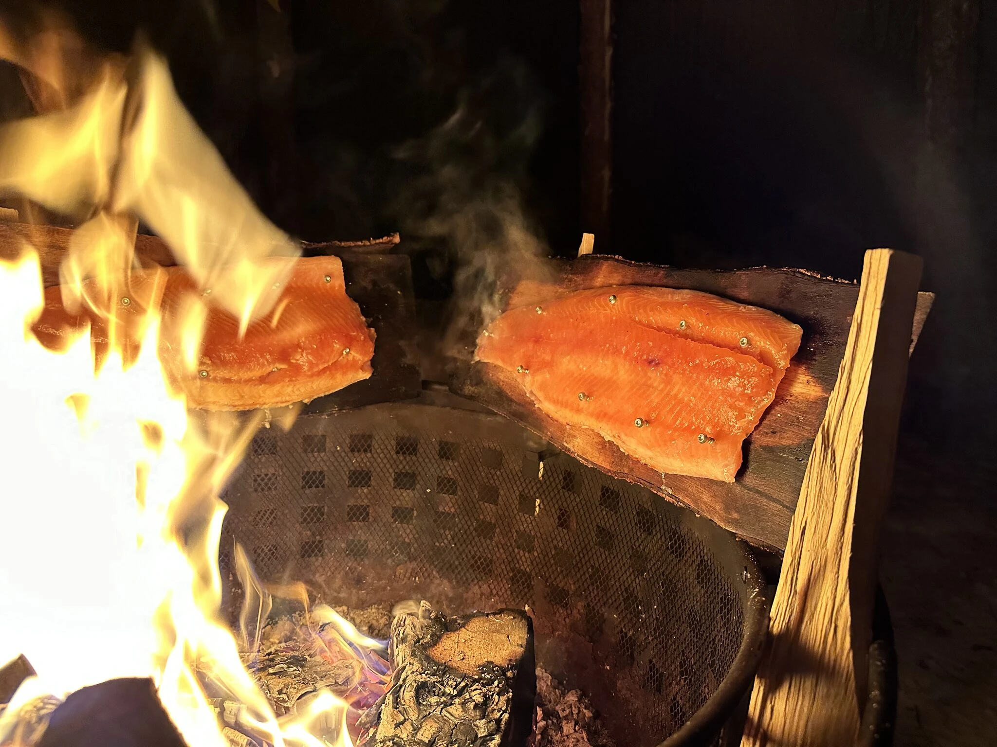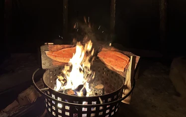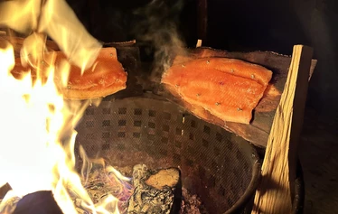 Localwild fish (pikeor zander) prepared over open fire in nature, enjoyed outdoors in a peaceful lakeside setting.